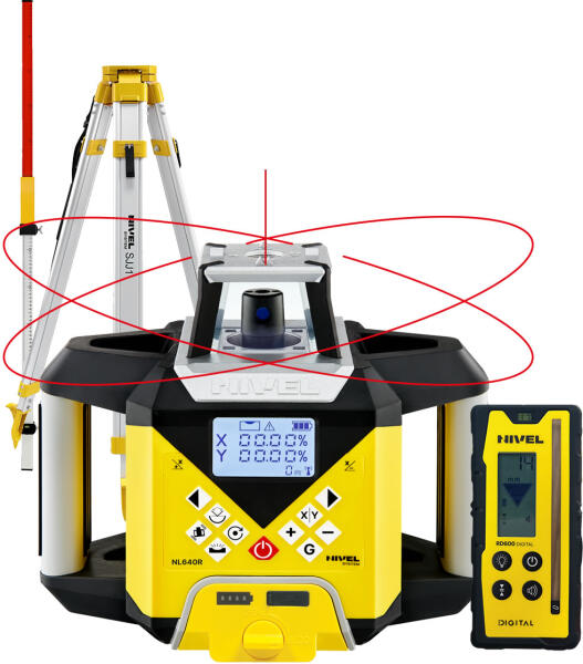 A Nivel System NL640R DIGITAL forgólézer automatikus önszintezéssel működik, így bekapcsolás után azonnal használatra kész. A digitális érzékelő lehetővé teszi a numerikus magasságkülönbség közvetlen leolvasását, így nincs szükség manuális értelmezésre. A digitális lejtésállítás pedig ±10% tartományban, két tengely mentén biztosítja a pontos szögbeállítást.