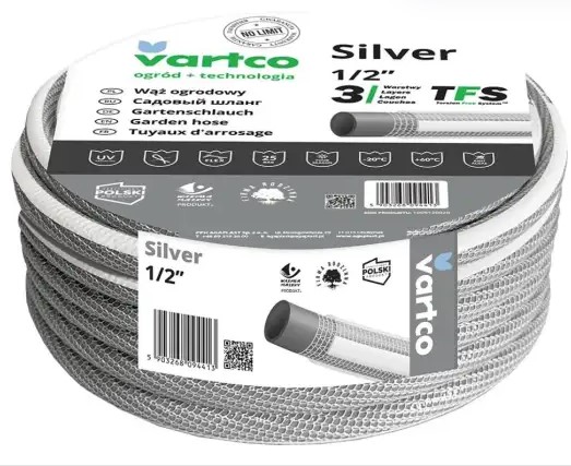 Kerti tömlő Vartco Silver TFS 1/2" 20m. 3 rétegű - szürke lélek, poliészter fonal trikot fonat. A legmagasabb minőségű, vastagított átlátszó fóliát. TFS (Torziómentes Rendszer) rendszer, amely megvédi a tömlőt a csavarodástól. Nagyon rugalmas, tartós és tartós. Ellenáll alacsony és magas hőmérsékletnek, UV-sugárzásnak, csavarodásnak és csomózásnak. Kadmiummentes, bárium- és ólommentes, ellenálló az algák lerakódásával.