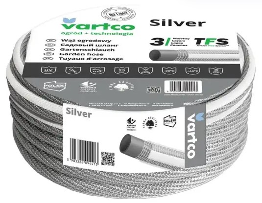 Kerti tömlő Vartco Silver TFS 3/4" 20m. 3 rétegű - lélekszürke, poliészter fonal trikot fonat. A legmagasabb minőségű, vastagított átlátszó fóliát. TFS (Torziómentes Rendszer) rendszer, amely megvédi a tömlőt a csavarodástól. Nagyon rugalmas, tartós és tartós. Ellenáll alacsony és magas hőmérsékletnek, UV-sugárzásnak, csavarodásnak és csomózásnak. Kadmiummentes, bárium- és ólommentes, ellenálló az algák lerakódásával.