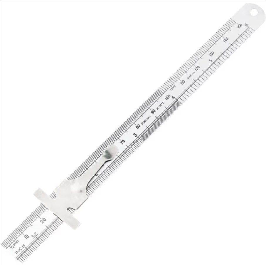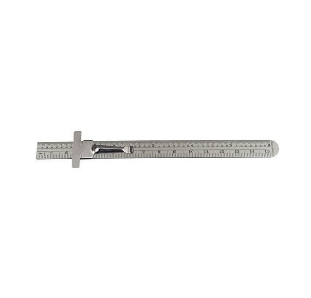 Rugalmas, megeresztett, rozsdamentes acélpenge. 13mm széles penge zsebakasztóval és mélységmérő csúszkával. A hátlapján 1/64" / mm átváltási táblázat. Mélységmérésre is használható. A skála beosztása metrikus és inches.
